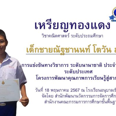 ขอชื่นชมและแสดงความยินดีกับ เด็กชายณัฐชานนท์ โตวัน นักเรียนชั้นมัธยมศึกษาปีที่ 1/2 ได้รับรางวัลเหรียญทองแดง วิชาคณิตศาสตร์ ระดับประถมศึกษา ในการแข่งขันทางวิชาการระดับนานาชาติ ประจำปี พ.ศ. 2567 (รอบสอง ระดับประเทศ) จัดสอบที่ โรงเรียนอนุบาลเชียงใหม่ เมื่อวันที่ 18 พฤษภาคม 2567 โดยสำนักงานคณะกรรมการการศึกษาขั้นพื้นฐาน (สพฐ.)