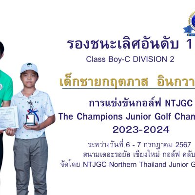 ขอชื่นชมและร่วมแสดงความยินดีกับ เด็กชายกฤตภาส อินกวา ได้รับรองชนะเลิศ อันดับ 1 Class Boy – C DIVISION 2 การแข่งขันกอล์ฟ รายการ NTJGC-The Champions Junior Golf Chamships 2023-2024 เมื่อวันที่ 6 – 7 กรกฎาคม 2567 ณ Royal Chiangmai Golf & Resort จัดโดย NTJGC Northern Thailand Junior Golf Club