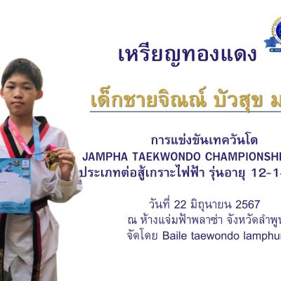 ขอชื่นชมและร่วมแสดงความยินดีกับ เด็กชายจิณณ์ บัวสุข นักเรียนชั้นมัธยมศึกษาปีที่ 1/9 ได้รับเหรียญทองแดง ประเภทต่อสู้เกราะไฟฟ้า รุ่นอายุ 12-14 ปี ชาย 33-37 กก การแข่งขันเทควันโด JAMPHA TAEKWONDO CHAMPIONSHIP 2024 วันที่ 22 มิถุนายน 2567 ณ Jampha Shopping Mall Lamphun จัดโดย สโมสร Baile Taekwondo Lamphun