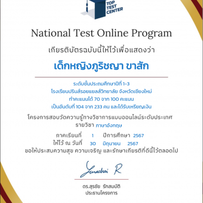 ขอเเสดงความชื่นชมยินดี เด็กหญิงภูริชญา ขาสัก ป.1/1
