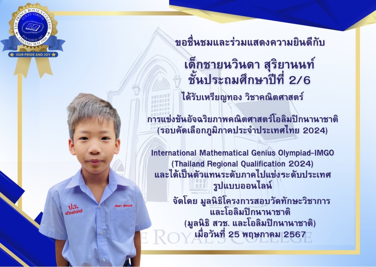 ได้รับรางวัลเหรียญทอง วิชาคณิตศาสตร์ในการแข่งขันอัจฉริยภาพคณิตศาสตร์โอลิมปิกนานาชาติ(รอบคัดเลือกภูมิภาคประจำประเทศไทย 2024)International Mathematical Genius Olympiad-IMGO (Thailand Regional Qualification 2024)และได้เป็นตัวแทนระดับภาคไปแข่งนะดับประเทศ จัดโดยมูลนิธิโครงการสอบวัดทักษะวิชาการและโอลิมปิกนานาชาติ(มูลนิธิ สวช. และโอลิมปิกนานาชาติ)