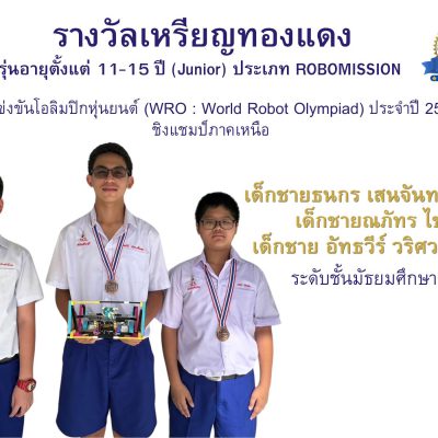 ขอชื่นชมและแสดงความยินดีกับ เด็กชายธนกร เสนจันทร์ฒิไชย เด็กชายณภัทร ไชยวงศา และเด็กชาย อัทธวีร์ วริศวงศ์โกศล นักเรียนชั้นมัธยมศึกษาตอนต้น ที่ได้รับรางวัลเหรียญทองแดง รุ่นอายุตั้งแต่ 11-15ปี (Junior) ประเภท ROBOMISSION ในนามทีม “MEP:SAT” จากการแข่งขันโอลิมปิกหุ่นยนต์ (WRO : World Robot Olympiad) ประจำปี 2567 ชิงแชมป์ภาคเหนือ