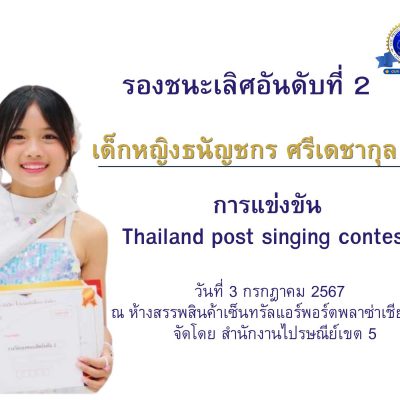 ขอชื่นชมและร่วมแสดงความยินดีกับ เด็กหญิงธนัญชกร ศรีเดชากุล นักเรียนชั้นมัธยมศึกษาปีที่ 1/11 ได้รับรางวัลรองชนะเลิศอันดับที่ 2 การแข่งขัน Thailand post singing contest ณ ห้างสรรพสินค้าเซ็นทรัลแอร์พอร์ตพลาซ่าเชียงใหม่ จัดโดยสำนักงานไปรษณีย์เขต 5 เมื่อวันที่ 3 กรกฎาคม 2567