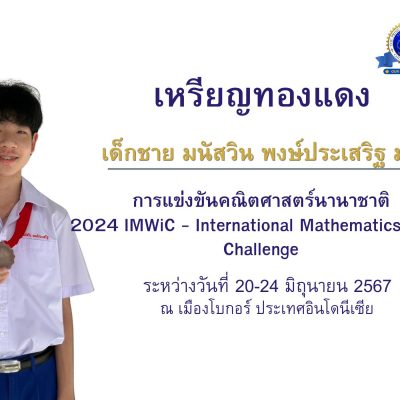 ขอแสดงความชื่นชมยินดีกับ เด็กชาย มนัสวิน พงษ์ประเสริฐ นักเรียนชั้นมัธยมศึกษาปีที่ 2 ที่ได้รับรางวัลเหรียญทองแดงในการแข่งขันคณิตศาสตร์นานาชาติ รายการ2024 IMWiC – International Mathematics Wizard Challenge ระหว่างวันที่ 20-24 มิถุนายน 2567 ณ เมืองโบกอร์ ประเทศอินโดนีเซีย (ระดับนานาชาติ)