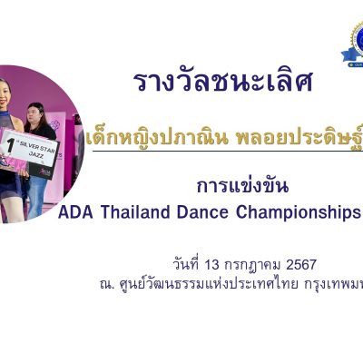 ขอชื่นชมและร่วมแสดงความยินดีกับ เด็กหญิงปภาณิน พลอยประดิษฐ์ นักเรียนชั้นมัธยมศึกษาปีที่ 1/5 เป็นตัวแทนเข้าร่วมการแข่งขัน ADA Thailand Dance Championships 2024 ณ ศูนย์วัฒนธรรมแห่งประเทศไทย กรุงเทพมหานคร เมื่อวันเสาร์ที่ 13 กรกฎาคม 2567 ได้รับรางวัล