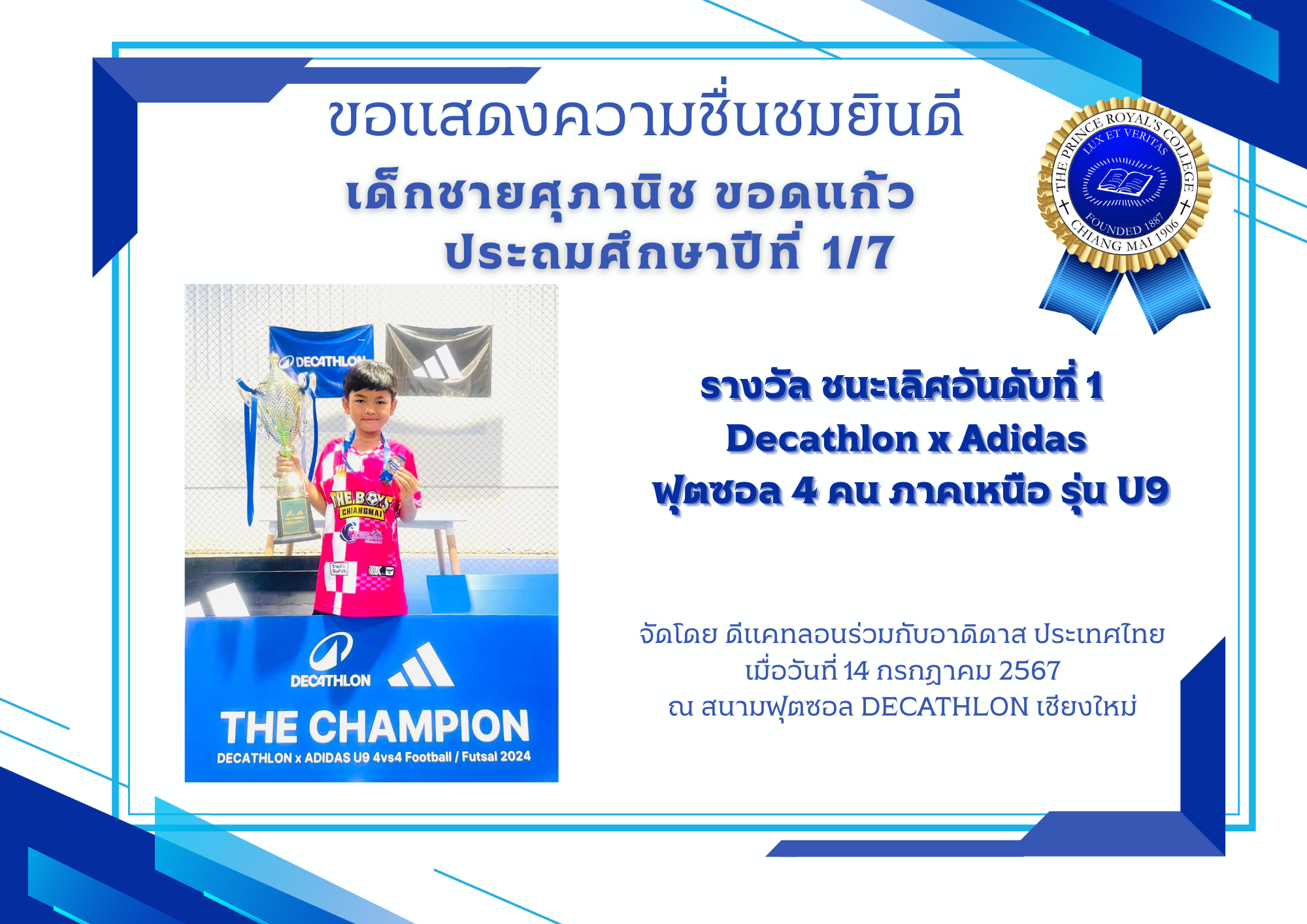 ได้รับ รางวัล ชนะเลิศอันดับที่ 1 Decathlon x Adidas ฟุตซอล 4 คน ภาคเหนือ รุ่น U9