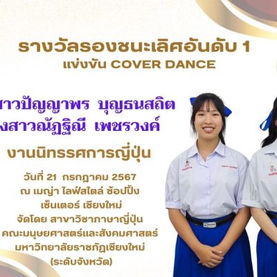 ขอชื่นชมและแสดงความยินดีกับ นางสาวปัญญาพร บุญธนสถิต และ นางสาวณัฏฐิณี เพชรวงค์ ม.6/8 ที่ได้รับรางวัลรองชนะเลิศอันดับ 1 แข่งขัน Cover Dance จากการร่วมงานนิทรรศการญี่ปุ่น เมื่อวันที่ 21 กรกฎาคม 2567 ณ เมญ่า ไลฟ์สไตล์ ช้อปปิ้ง เซ็นเตอร์ เชียงใหม่ จัดโดย สาขาวิชาภาษาญี่ปุ่น คณะมนุษยศาสตร์และสังคมศาสตร์ มหาวิทยาลัยราชภัฏเชียงใหม่ (ระดับจังหวัด)