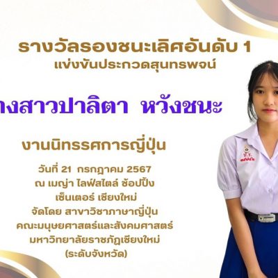 ขอชื่นชมและแสดงความยินดีกับ นางสาวปาลิตา หวังชนะ ม.5/11 ที่ได้รับรางวัลรองชนะเลิศอันดับ 1 แข่งขันประกวดสุนทรพจน์ จากการร่วมงานนิทรรศการญี่ปุ่น เมื่อวันที่ 21 กรกฎาคม 2567 ณ เมญ่า ไลฟ์สไตล์ ช้อปปิ้ง เซ็นเตอร์ เชียงใหม่ จัดโดย สาขาวิชาภาษาญี่ปุ่น คณะมนุษยศาสตร์และสังคมศาสตร์ มหาวิทยาลัยราชภัฏเชียงใหม่ (ระดับจังหวัด)