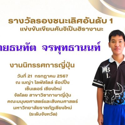 ขอชื่นชมและแสดงความยินดีกับ นายธนทัต จรพุทธานนท์ ม.5/9 ที่ได้รับรางวัลรองชนะเลิศอันดับ 1 แข่งขันเขียนคันจิเป็นฮิรางานะ จากการร่วมงานนิทรรศการญี่ปุ่น เมื่อวันที่ 21 กรกฎาคม 2567 ณ เมญ่า ไลฟ์สไตล์ ช้อปปิ้ง เซ็นเตอร์ เชียงใหม่ จัดโดย สาขาวิชาภาษาญี่ปุ่น คณะมนุษยศาสตร์และสังคมศาสตร์ มหาวิทยาลัยราชภัฏเชียงใหม่ (ระดับจังหวัด)