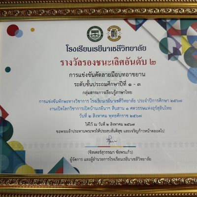 ขอชื่นชมและร่วมแสดงความยินดีกับ เด็กหญิงอัยย์ญาดา ใจบุญนอก นักเรียนระดับชั้นประถมศึกษาปีที่ 2/5 ได้รับรางวัลรองชนะเลิศอันดับ 2 การแข่งขันคัดลายมือบทอาขยาน ระดับประถมศึกษาปีที่ 1-3