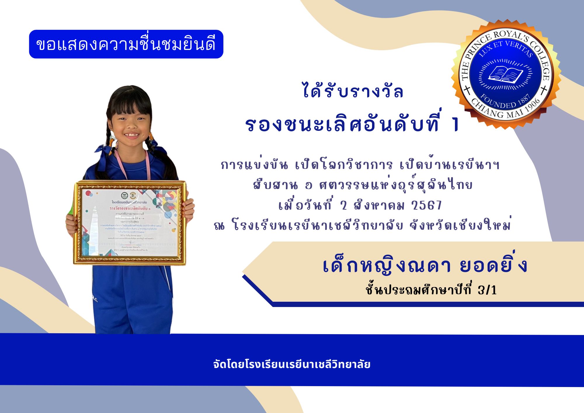 ขอแสดงความชื่นชมยินดีกับ เด็กหญิงณดา ยอดยิ่ง นักเรียนชั้นประถมศึกษาปีที่ 3/1