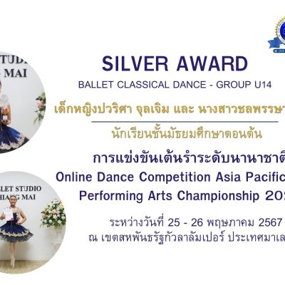 ขอชื่นชมและ ร่วมแสดงความยินดีกับ เด็กหญิงปวริศา จุลเจิม และ นางสาวชลพรรษา สุขแสง ได้รับรางวัล SILVER AWARD ประเภท BALLET CLASSICAL DANCE – GROUP U14 ( อายุไม่เกิน 14 ปี ) ในการแข่งขันเต้นรำระดับนานาชาติ Online Dance Competition Asia Pacific Youth Performing Arts Championship 2024 ระหว่างวันที่ 25 – 26 พฤษภาคม 2567 จัดโดย YPAC 2024 International Youth Performing Arts Championship 2024