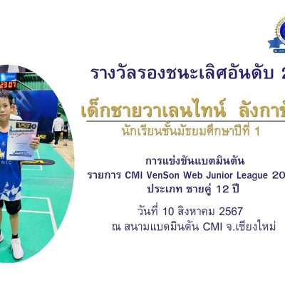 ขอชื่นชม และร่วมแสดงความยินดีกับ เด็กชายวาเลนไทน์ ลังกาชัย นักเรียนชั้นมัธยมศึกษาปีที่ 1/2 ได้รับรางวัลรองชนะเลิศ อันดับ 2 การแข่งขันแบตมินตัน รายการCMI VenSon Web Junior League 2024 Section Two #1 ประเภท ชายคู่อายุ 12 ปี ณ สนามแบดมินตัน CMI จ.เชียงใหม่ เมื่อวันที่ 10 สิงหาคม พ.ศ. 2567