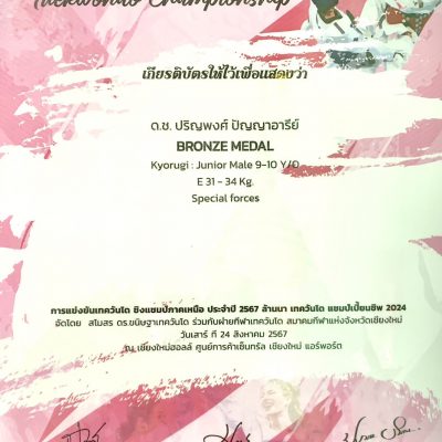 ขอชื่นชมและร่วมแสดงความยินดีกับ เด็กชายปริญพงศ์ ปัญญาอารีย์ นักเรียนชั้นประถมศึกษาปีที่ 2/10ได้รางวัล BRONZE MEDAL Kyorugi : Junior Male 9-10Y ในการแข่งขันกีฬาเทควันโดชิงแชมป์ภาคเหนือ ล้านนาเทควันโดแชมป์เปี้ยนชิพ “Lanna Tae Kwon Do Championship 2024 ปี 2567” จัดโดย สโมสรขนิษฐาเทควันโด ร่วมกับฝ่ายกีฬาเทควันโด สมาคมกีฬาแห่งจังหวัดเชียงใหม่ ณ เชียงใหม่ฮอลล์ ศูนย์การค้าเซ็นทรัลเชียงใหม่แอร์พอร์ต เมื่อวันเสาร์ที่ 24 สิงหาคม 2567