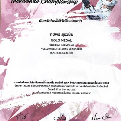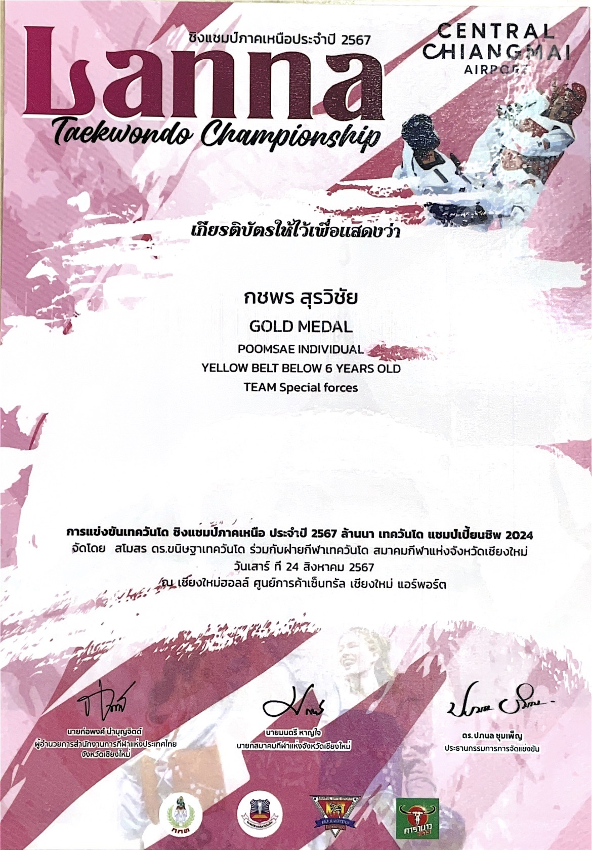 ขอชื่นชมและแสดงความยินดีกับเด็กหญิงกชพร สุรวิชัย อนุบาล 3/8 ได้รับรางวัล GOLD MEDEL POOMSAE INDIVIDUAL YELLOW BELT BELOW 6 YEARS OLD TEAM Special forces จากการแข่งข้นเทคว้นโด ชิงแชมป์ภาคเหนือ ประจำปี 2567 Lanna Taekwondo Championship 2024 จัดโดย สโมสร ดร.ขนิษฐาเทควันโด ร่วมกับฝ่ายกีฬาเทควันโด สมาคมกีฬาแห่งจังหวัดเชียงใหม่วันเสาร์ที่ 24 สิงหาคม 2567 ณ เชียงใหม่ฮอลล์ ศูนย์การค้าเซ็นทรัลเชียงใหม่แอร์พอร์ต