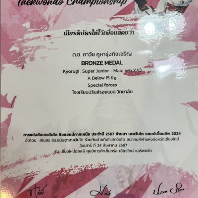 ขอชื่นชมและแสดงความยินดีกับเด็กชายภาวัช คูหารุ่งกิจเจริญ อนุบาล 3/10 ได้รับรางวัล Bronze Medal ประเภทต่อสู้ Super junior Male รุ่นอายุ 5 – 6 ปี น้ำหนัก A below 15 kg. Special Forces จากการแข่งข้นเทควันโด ชิงแชมป์ภาคเหนือ ประจำปี 2567 Lanna Taekwondo Championship 2024 จัดโดย สโมสร ดร.ขนิษฐาเทควันโด ร่วมกับฝ่ายกีฬาเทควันโด สมาคมกีฬาแห่งจังหวัดเชียงใหม่ วันเสาร์ที่ 24 สิงหาคม 2567 ณ เชียงใหม่ฮอลล์ ศูนย์การค้าเซ็นทรัลเชียงใหม่แอร์พอร์ต