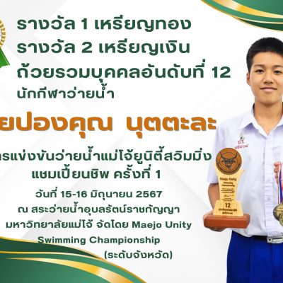 ขอชื่นชมและแสดงความยินดีกับ นายปองคุณ  นุตตะละ  ม.4/2  นักกีฬาว่ายน้ำ   ที่ได้รับรางวัล 1 เหรียญทอง, รางวัล 2 เหรียญเงิน  และถ้วยรวมบุคคลลำดับที่ 12   จากการแข่งขัน ว่ายน้ำแม่โจ้ยูนิตี้สวิมมิ่งแชมเปี้ยนชิพ ครั้งที่ 1  วันที่ 15 – 16 มิถุนายน 2567   ณ สระว่ายน้ำอุบลรัตน์ราชกัญญา มหาวิทยาลัยแม่โจ้  (ระดับจังหวัด)
