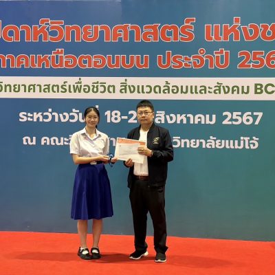 ขอชื่นชมและแสดงความยินดีกับ นางสาวธนัญชนก  ไชยดวงแก้ว  ม.6/7  ที่ได้รับรางวัลเหรียญทอง   จากการประกวดโครงงานวิทยาศาสตร์   สาขาวิทยาศาสตร์ประยุกต์   ในงานสัปดาห์วิทยาศาสตร์แห่งชาติ ภาคเหนือตอนบน ประจำปี 2567   ระหว่างวันที่  18 – 20 สิงหาคม 2567  ณ คณะวิทยาศาสตร์  มหาวิทยาลัยแม่โจ้  จัดโดยคณะวิทยาศาสตร์  มหาวิทยาลัยแม่โจ้  (ระดับภาค)