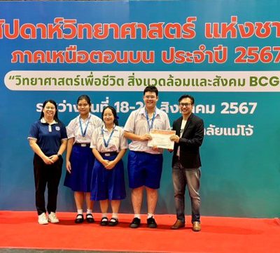 ขอชื่นชมและแสดงความยินดีกับทีมนักเรียน PRC ที่ได้รับรางวัลจากการแข่งขันโครงงานวิทยาศาสตร์ ระดับมัธยมศึกษาตอนปลาย ในงานสัปดาห์วันวิทยาศาสตร์แห่งชาติ ภาคเหนือตอนบน ประจำปี 2567 ระหว่างวันที่ 18 – 20 สิงหาคม 2567 ณ คณะวิทยาศาสตร์ มหาวิทยาลัยแม่โจ้ จัดโดย คณะวิทยาศาสตร์ มหาวิทยาลัยแม่โจ้