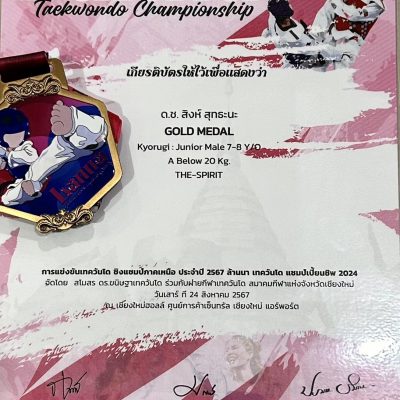 ได้รับรางวัล เหรียญทอง ประเภทต่อสู้ (Kyorugi) รุ่นอายุ 7-8 ปี(ชาย) น้ำหนัก 20 กิโลกรัม