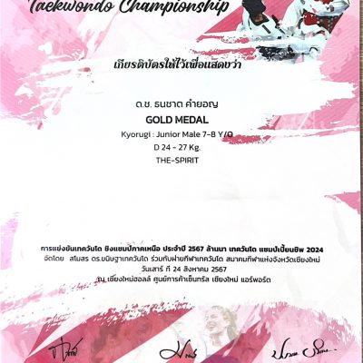 ได้รับรางวัล เหรียญทอง ประเภอต่อสู้ Kyorugi Junior Male รุ่นอายุ 7-8 ปี Class D (น้ำหนัก 24-27 Kg.)