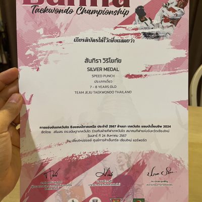 ได้รับรางวัล เหรียญเงิน Silver medal Speed punch ประเภทเดี่ยว 7-8 years old Team Jeju taekwondo Thailand