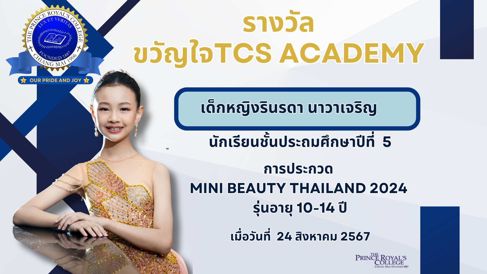 เด็กหญิงรินรดา นาวาเจริญ นักเรียนชั้นประถมศึกษาปีที่ 5 รางวัล ขวัญใจTCS ACADEMY ระดับประเทศ จากการประกวด MINI BEAUTY THAILAND 2024 รุ่นอายุ 10-14 ปี