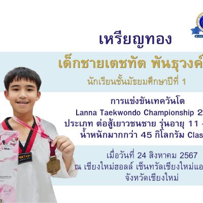 ขอชื่นชมและร่วมแสดงความยินดีกับ เด็กชายเตชทัต พันธุวงค์ราช นักเรียนชั้นมัธยมศึกษาปีที่ 1/8 ได้รับเหรียญทอง การแข่งขันกีฬาเทควันโด รายการ “Lanna Taekwondo Championship 2024” ประเภท ต่อสู้เยาวชนชาย รุ่นอายุ 11 – 12 ปี น้ำหนักมากกว่า 45 กิโลกรัม Class C เมื่อวันเสาร์ ที่ 24 สิงหาคม 2567 ณ เชียงใหม่ฮอลล์ เช็นทรัลเชียงใหม่แอร์พอร์ต จังหวัดเชียงใหม่