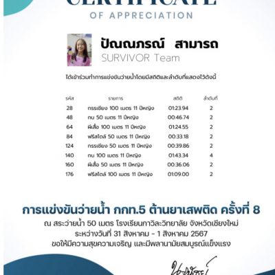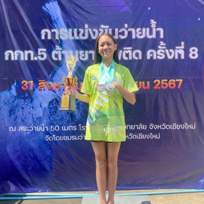 เด็กหญิงปัณณภรณ์ สามารถ นักเรียนชั้นประถมศึกษาปีที่ 6 ได้รับรางวัลชนะเลิศอันดับที่ 2 รุ่นอายุ 11 ปี หญิง ในการแข่งขันว่ายน้ำกกท.5 ต้านยาเสพติด ครั้งที่ 8