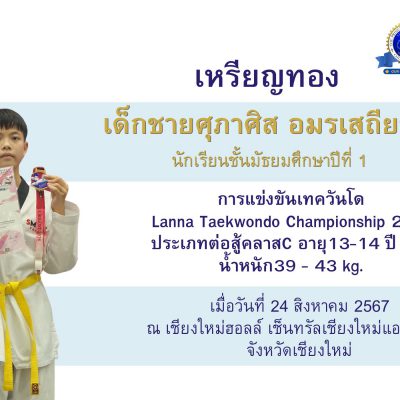 ขอชื่นชมและร่วมแสดงความยินดีกับ เด็กชายศุภาศิส อมรเสถียรพงศ์ นักเรียนชั้นมัธยมศึกษาปีที่ 1/9 ได้รับเหรียญทอง การแข่งขันกีฬาเทควันโด รายการ “Lanna Taekwondo Championship 2024” ประเภท ต่อสู้คลาส C อายุ 13 – 14 ปี ชาย น้ำหนัก 39 – 43 kg. เมื่อวันเสาร์ ที่ 24 สิงหาคม 2567 ณ เชียงใหม่ฮอลล์ เช็นทรัลเชียงใหม่แอร์พอร์ต จังหวัดเชียงใหม่