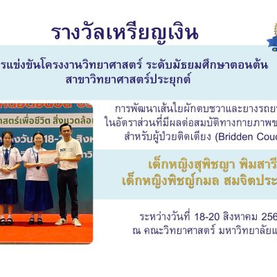 ขอชื่นชมและร่วมแสดงความยินดีกับ เด็กหญิงสุพิชญา พิมสารี และเด็กหญิงพิชญ์กมล สมจิตประเสริฐ นักเรียนชั้นมัธยมศึกษาปีที่ 3/4 ได้รับเหรียญเงิน พร้อมเงินรางวัล 3,000 บาท ในการแข่งขันโครงงานวิทยาศาสตร์ ระดับมัธยมศึกษาตอนต้น สาขาวิทยาศาสตร์ประยุกต์ เรื่องการพัฒนาเส้นใยผักตบชวาและยางรถยนต์บดในอัตราส่วนที่มีผลต่อสมบัติทางกายภาพของเบาะสำหรับผู้ป่วยติดเตียง (Bridden Couch) งานสัปดาห์วิทยาศาสตร์แห่งชาติ ภาคเหนือตอนบน ประจำปี 2567 ระหว่างวันที่ 18-20 สิงหาคม 2567 ณ คณะวิทยาศาสตร์ มหาวิทยาลัยแม่โจ้