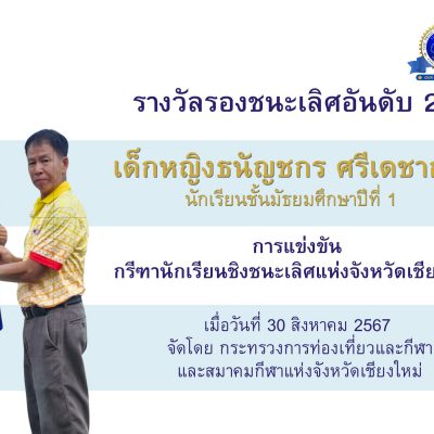 ขอชื่นชม และร่วมแสดงความยินดีกับ เด็กหญิงธนัญชกร ศรีเดชากุล นักเรียนชั้นมัธยมศึกษาปีที่ 1/11 ได้รับรางวัลรองชนะเลิศอันดับที่ 2 (เหรียญทองแดง) การแข่งขันกรีฑานักเรียนชิงชนะเลิศแห่งจังหวัดเชียงใหม่ เมื่อวันที่ 30 สิงหาคม 2567 ณ สนามกีฬาเทศบาลนครเชียงใหม่ จัดโดยกระทรวงการท่องเที่ยวและกีฬา และสมาคมกีฬาแห่งจังหวัดเชียงใหม่