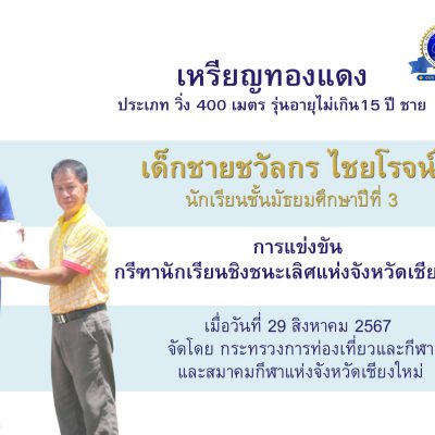 เด็กชายชวัลกร ไชยโรจน์ เหรียญทองแดงประเภท วิ่ง 400 เมตร รุ่นอายุไม่เกิน15ปี ชาย การแข่งขันกรีฑานักเรียนชิงชนะเลิศแห่งจังหวัดเชียงใหม่