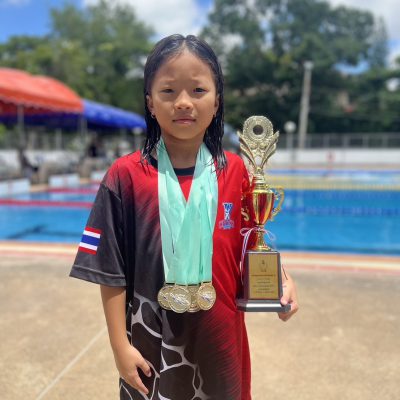 ได้รับรางวัล การแข่งขันว่ายน้ำ รุ่น 9ปี หญิง ดังนี้ ถ้วยรางวัลบุคคลชนะเลิศอันดับที่ 6