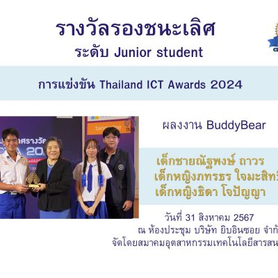 ขอชื่นชมและร่วมแสดงความยินดีกับ เด็กชายณัฐพงษ์ ถาวร เด็กหญิงภทรธร ใจมะสิทธิ์ และเด็กหญิงธิดา โจปัญญา นักเรียนชั้นมัธยมศึกษาตอนต้น ได้รับ รางวัลรองชนะเลิศ ระดับ Junior student (ผลงาน BuddyBear) ในการแข่งขัน Thailand ICT Awards 2024 โดยมีพิธีมอบรางวัล TICTA2024 ในวันที่ 31 สิงหาคม 2567 ณ ห้องประชุม บริษัท ยิบอินซอย จำกัด จัดโดยสมาคมอุตสาหกรรมเทคโนโลยีสารสนเทศไทย และ ได้รับสิทธิเป็นตัวแทนประเทศไทย เข้าร่วมแข่ง The Asia Pacific ICT Alliance Awards (APICTA) ณ ประเทศบรูไน ในวันที่ 4-7 ธันวาคม 2567