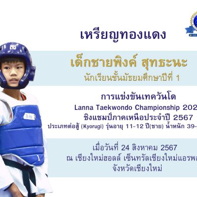 ขอชื่นชมและร่วมแสดงความยินดีกับ เด็กชายพิงค์ สุทธะนะ นักเรียนชั้นมัธยมศึกษาปีที่ 1/7 ได้รับรางวัล เหรียญทองแดง จากการแข่งขันเทควันโด ประเภทต่อสู้ (Kyorugi) รุ่นอายุ 11-12 ปี(ชาย) น้ำหนัก 39-42 กิโลกรัม ในการแข่งขัน Lanna Taekwondo Championship 2024 (ชิงแชมป์ภาคเหนือประจำปี 2567) เมื่อวันที่ 24 สิงหาคม 2567 ณ เชียงใหม่ฮอลล์ ศูนย์การค้าเซ็นทรัล เชียงใหม่ แอร์พอร์ต จังหวัดเชียงใหม่