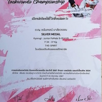 - รางวัลเหรียญเงิน (SILVER MEDAL) Kyorugi : Junior Female 9-10 YEARS OLD F 34 – 37 Kg.