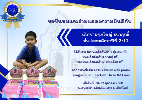 ขอชื่นชมและร่วมแสดงความยินดีกับ เด็กชายศุภวิชญ์ ธนาฤทธิ์ ชั้นประถมศึกษาปีที่ 3/14 ได้รับรางวัล ชนะเลิศอันดับ1 คู่ผสม 8ปี ชนะเลิศอันดับ1 ชายคู่ 8ปี รองชนะเลิศอันดับ2 ชายเดี่ยว 8ปี จากรายการที่ไปแข่ง CMI VenSon web junior league 2025 section Three #3 Final