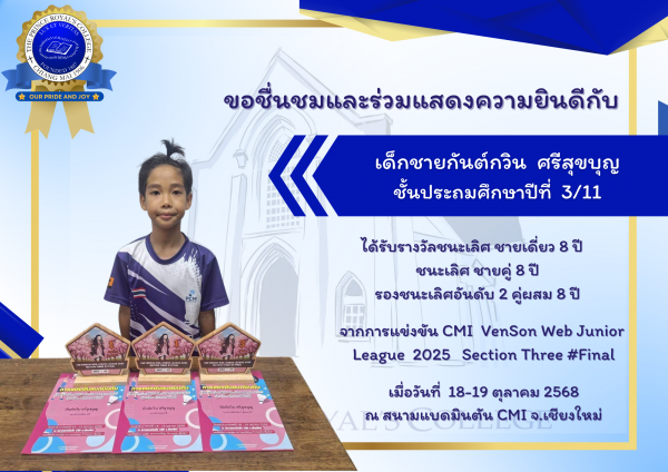 ขอชื่นชมและร่วมแสดงความยินดีกับ เด็กชายกันต์กวิน ศรีสุขบุญ ชั้นประถมศึกษาปีที่ 3/11 ได้รับรางวัล ชนะเลิศ ชายเดี่ยว 8 ปี ชนะเลิศ ชายคู่ 8 ปี รองชนะเลิศอันดับ 2 คู่ผสม 8 ปี จากรายการที่ไปแข่ง CMI VenSon Web Junior League 2025 Section Three #Final