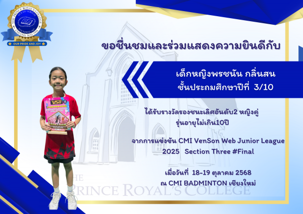 ขอชื่นชมและร่วมแสดงความยินดีกับ เด็กหญิงพรชนัน กลิ่นสน ชั้นประถมศึกษาปีที่ 3/10 ได้รับรางวัล รองชนะเลิศอันดับ2 หญิงคู่ รุ่นอายุไม่เกิน10ปี จากรายการที่ไปแข่ง CMI VenSon Web Junior League 2025 Section Three #Final