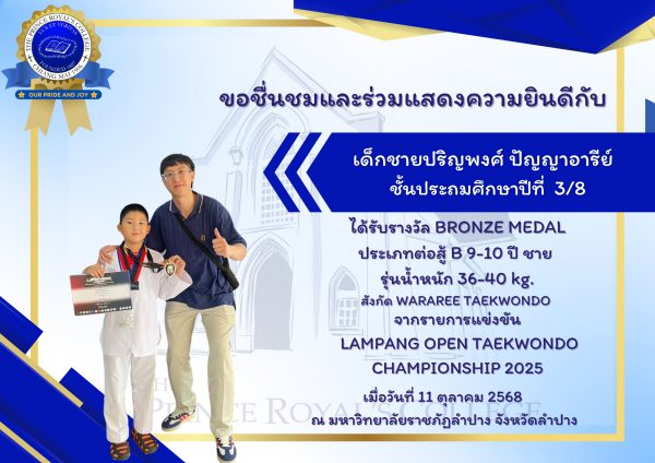 ขอชื่นชมและร่วมแสดงความยินดีกับเด็กชายปริญพงศ์ ปัญญาอารีย์ นักเรียนชั้นประถมศึกษาปีที่ 3/8 ได้รับรางวัล BRONZE MEDAL ประเภทต่อสู้ B 9-10 ปี ชาย รุ่นน้ำหนัก 36-40 kg. จากรายการแข่งขัน LAMPANG OPEN TAEKWONDO CHAMPIONSHIP 2025