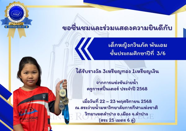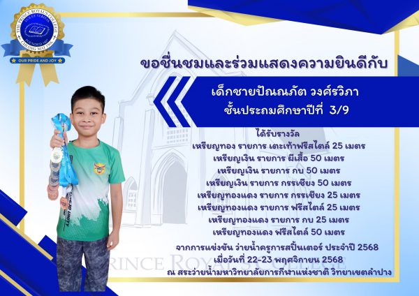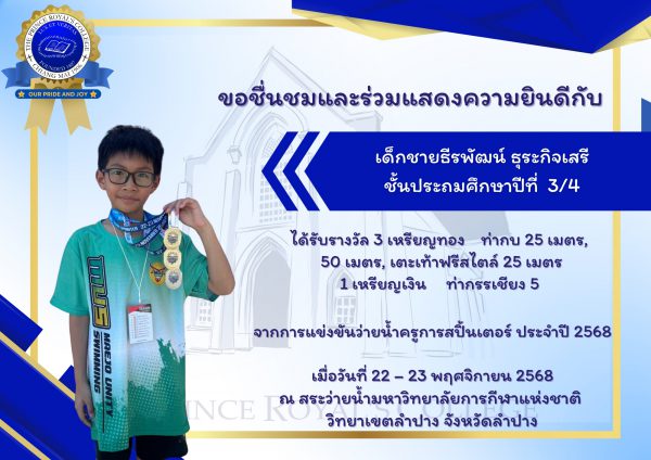 ขอชื่นชมและร่วมแสดงความยินดีกับเด็กชายธีรพัฒน์ ธุระกิจเสรี ชั้นประถมศึกษาปีที่ 3/4 ได้รับรางวัล 3 เหรียญทอง ท่ากบ 25 เมตร และ 50 เมตร, เตะเท้าฟรีสไตล์ 25 เมตร 1 เหรียญเงิน ท่ากรรเชียง 50 เมตร จากการแข่งขัน ว่ายน้ำครูการสปิ้นเตอร์ ประจำปี 2568