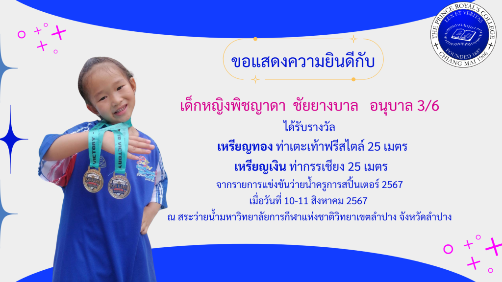 เด็กหญิงพิชญาดา ชัยยางบาล รางวัลการแข่งขันว่ายน้ำ ครูการสปิ้นเตอร์ 2567