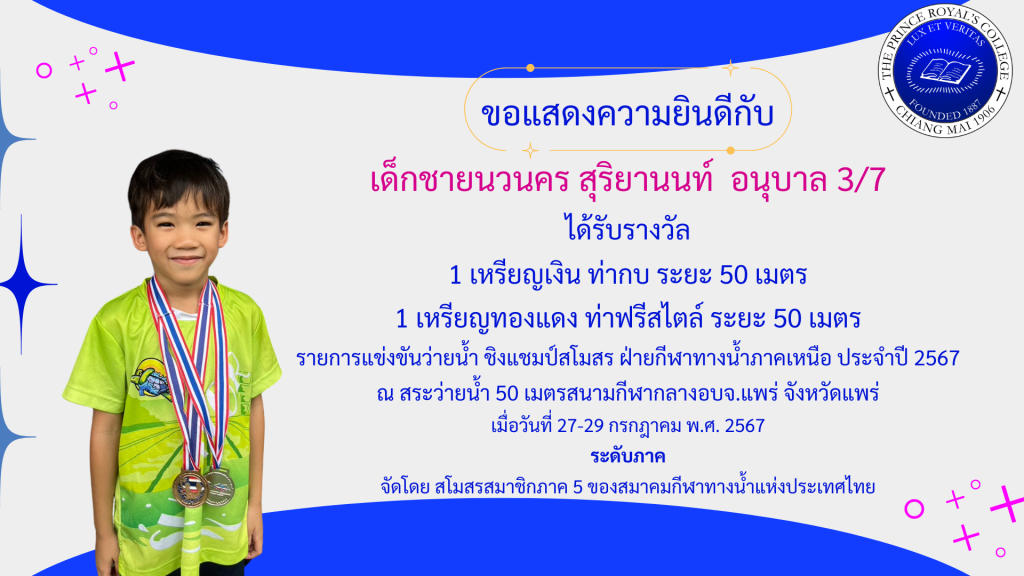 เด็กชายนวนคร สุริยานนท์ รางวัลการแข่งขันว่ายน้ำ ชิงแชมป์สโมสร ฝ่ายกีฬาทางน้ำภาคเหนือ ประจำปี 2567