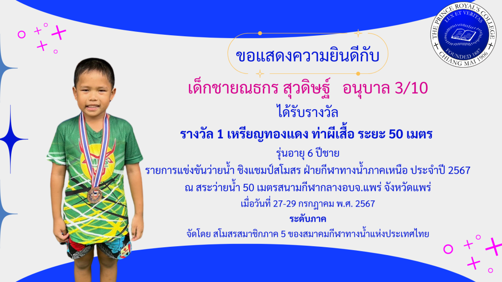เด็กชายณธกร สุวดิษฐ์ รางวัลการแข่งขันว่ายน้ำ ชิงแชมป์สโมสร ฝ่ายกีฬาทางน้ำภาคเหนือ ประจำปี 2567