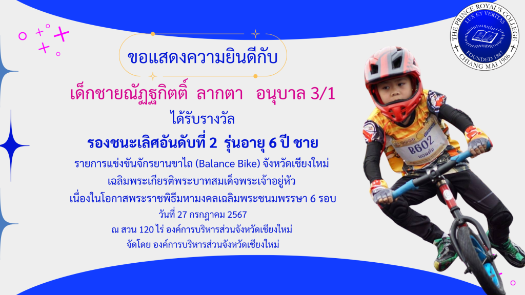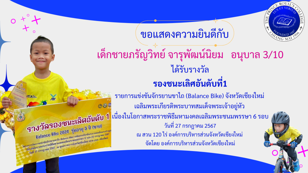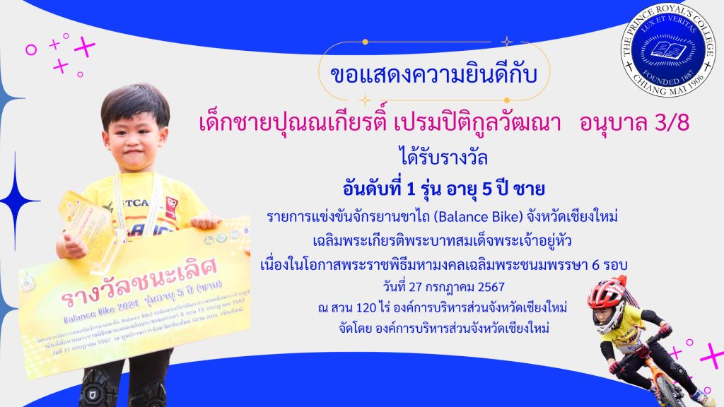 เด็กชายปุณณเกียรติ์ เปรมปิติกูลวัฒณา รางวัลการแข่งขันจักรยานขาไถ (Balance Bike)