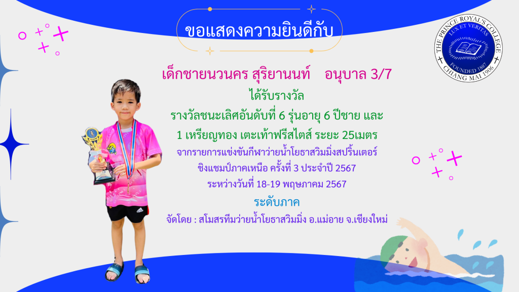 เด็กชายนวนคร สุริยานนท์ รางวัลการแข่งขันว่ายน้ำ จากการแข่งขันกีฬาว่ายน้ำโยธาสวิมมิ่งสปริ้นเตอร์ ชิงแชมป์ภาคเหนือ ครั้งที่ 3