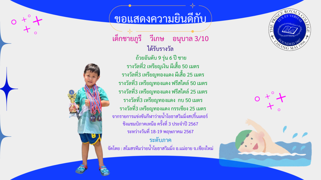 เด็กชายภูรี วีเกษ รางวัลการแข่งขันรายการว่ายน้ำโยธาสวิมมิ่งสปริ้นเตอร์ชิงแชมป์ภาคเหนือ ครั้งที่ 3 ประจำปี 2567