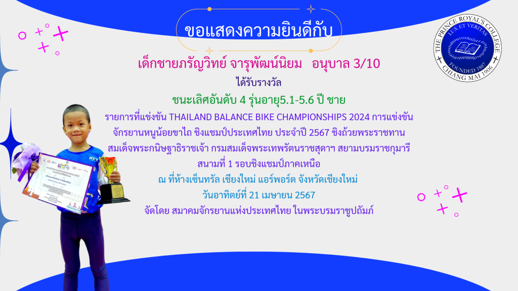 เด็กชายภรัญวิทย์ จารุพัฒน์นิยม รางวัลการที่แข่งขัน THAILAND BALANCE BIKE CHAMPIONSHIPS 2024