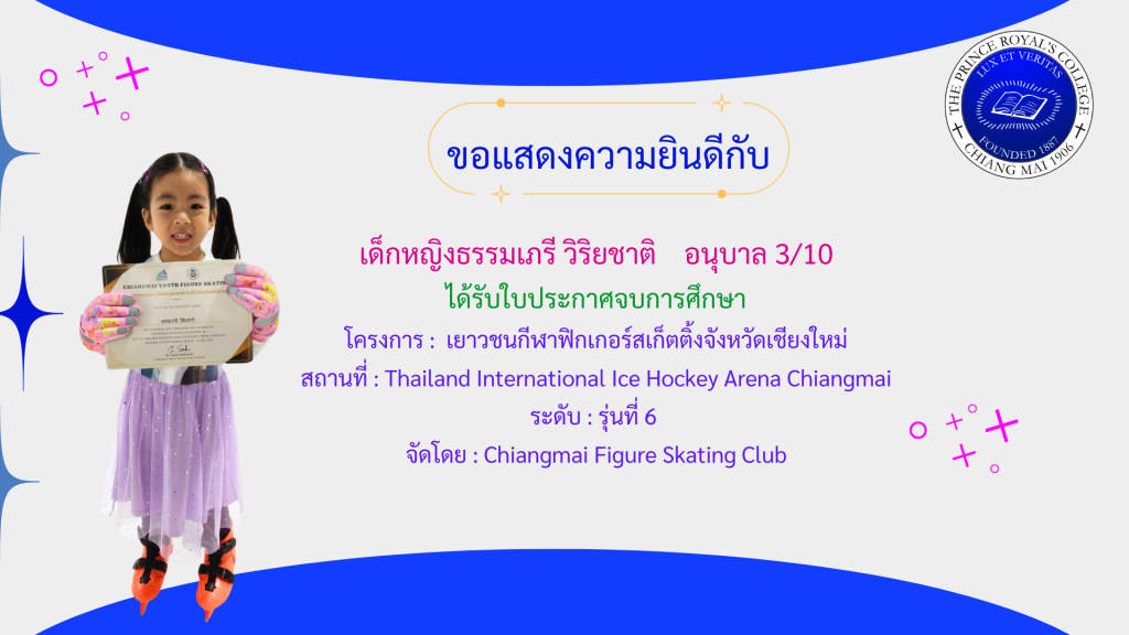 เด็กหญิงธรรมเภรี วิริยชาติ ได้รับใบประกาศจบการศึกษา โครงการเยาวชนกีฬาฟิกเกอร์สเก็ตติ้งจังหวัดเชียงใหม่